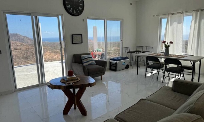 Linda casa ubicada en una hermosa colina en la cual tendrás una vista excepcional de todo el parque nacional Cabo pulmo (mar y montañas). Acondicionada con 1 habitación con 2 camas matrimoniales y baño privado, 1 baño adicional en la sala, cocina, comedor, wifi, smart tv en recamara y sala, balcón, estacionamiento privado. la casa está ubicada a 3km de las tiendas de buceo y restaurantes (8min manejando en auto convencional).