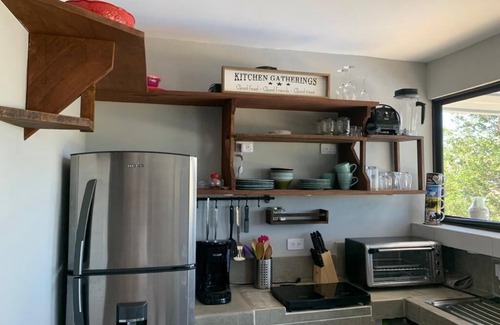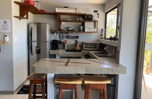 Casa Sol or Sun is the two bedroom, two-bathroom home with the private pool. It offers a huge balcony with incredible views of the treetops, ocean and mountains. This spectacular home gives you a quaint open concept feeling with a nice sized kitchen that offers rustic concrete counters, open shelves and is extremely well equipped with everything you need to cook your own meals if you choose to dine in. There is a communal bbq, located beyond the showers and a beautiful terrace where you can have your morning coffee or breakfast. Or better still, you can swing in the hammock on the wooden deck overlooking the jungle, and mountains. There are many different species of birds that come to perch on nearby trees. Little green parrots love to come and say hi. Or the mono, or monkey, will also come at their will and howl, as they are called Howler Monkeys. They are shy, timid and harmless but a pleasure to watch.