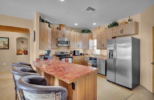 This newer built desert home has been very well maintained. The spacious layout of the home features high ceilings with an open concept living room/kitchen. For privacy, the main bedroom with king sized bed and en suite bathroom is located on one side of the home. 2 smaller bedrooms with queen sized beds are on the other side of the home. The beds feature hotel quality linens and cotton towels in the bathrooms. If workspace is needed, a desk with printer is located in one of the bedrooms along with WiFi that works throughout the house. In the living room there is a 50" TV with Dish Network. If you choose not to dine out, the kitchen is equipped with stainless steel appliances and stocked with pots & pans, a rice cooker, pressure cooker, air fryer, toaster, blender, etc. There is also a BBQ for grilling and Keurig coffee maker.