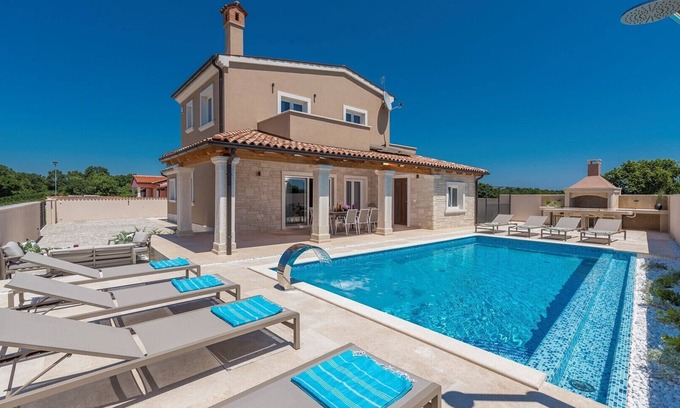 Modern and magic holiday house in Jadreski near Pula with private pool for 8 persons ideal for a relaxing family holiday. Villa Tea consists of a fully equipped modern kitchen and living room. From the spacious and relaxing living area, there is an exit on the terrace where you can find a dining table, pool, and BBQ area. Two bedrooms with a bathroom are located on the ground floor. The first floor of this newly built house consists of two bedrooms with private bathrooms. The rental price includes the use of the internet, air-conditioning in each room, bed linen and towels. Private parking is located in an enclosed courtyard. Come to Villa Tea with your family or friends and spend your unforgettable vacation in Istria. Pets are not allowed. The shops, restaurants, playgrounds, and other sports can be found in the immediate vicinity. Party and young group of people are not permitted.