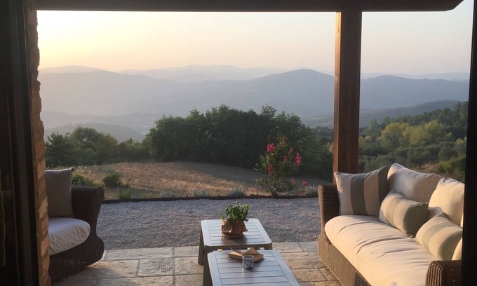 Brand new hilltop ultra modern heritage stone villa with oversized infinity pool on the Umbria Tuscany border facing magnificent sunset and looking towards the birthplace of MichaelAngelo.