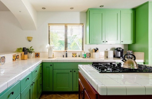 Grab a drink in the vibrant green kitchen, then head out to the pool terrace for a game of cornhole or a stroll around the cactus garden. This Spanish-style home in the heart of La Quinta combines sunny interior spaces with a dreamy backyard oasis.