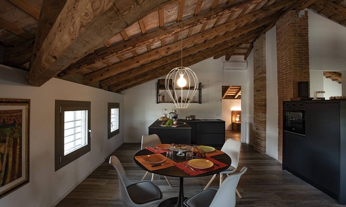 Tourist rental CIN IT026025B484TFQO6C. This elegant big attic is perfect as a starting point for discovering our area. Montello, Valdobbiadene, Asolo, Treviso.. and much more. The apartment is equipped with all comforts and has been renovated to have minimal environmental impact thanks to solar and photovoltaic panels with storage battery. , parking space and a closed garage for your bicycle. It is composed of a large living area with a double sofa bed, and a master bedroom with bathroom. The ceiling, characterized by wooden beams and stone tiles, will transport you to a magical place.