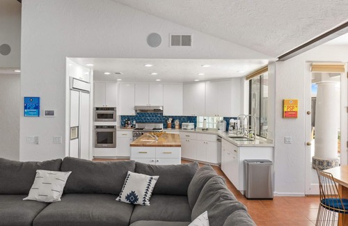The backyard of Casablanca has a private resort feel comprising chaise lounge chairs, daybeds with privacy curtains, commercial misting system, heated pool, full outdoor kitchen/bar and vast grassy area for outdoor movies, group yoga, games, etc. The property was designed with the intention of hosting and entertaining small to medium size groups; family vacations, golf retreats, bachelor/bachelorette parties, yoga retreats, corporate functions/retreats, and small weddings. The common spaces are designed to accommodate private gatherings with a focus on people interacting, eating, sleeping, drinking, and working together. Please inquire if you have questions about the usage of our property, we would be happy to help plan your trip to Casablanca, Off El Paseo.. Docusign Signature Required within 24 hours of booking. Link included upon booking.