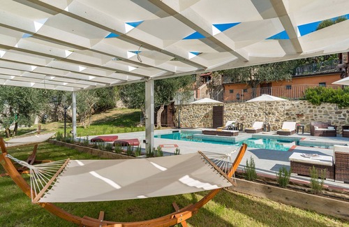 The horseshoe-shaped pool measures 8 x 8.5 m with a constant depth of 1.50 m and has chlorine purification and 6 easy steps for entry. The pool lining and the solarium area are both in light grey stoneware tiles that give the water a transparent, crystalline appearance. The 100 sq m solarium delineated by a stone wall is equipped with umbrellas, sunbeds, armchairs, pool mattresses, small tables and a cold-water shower. Continuing on from the solarium is a 40 sq m pergola in wood and fabric, installed on the lawn, with two king size hammocks. The swimming pool lies at a lower level than the house and the annex, 20 m away. It is reached from the house down 15 terracotta steps and a small grass ramp or down 15 tufa steps from the outdoor kitchen. The lighting inside the pool (two lights) and in the solarium area (lights and lamps) allow you to enjoy the pool in the evening and at night as well. The pool is available from the last Saturday of April to the first Saturday of October.