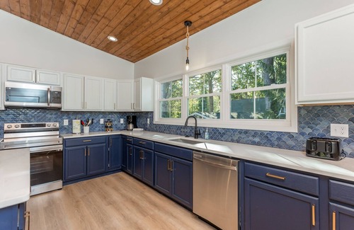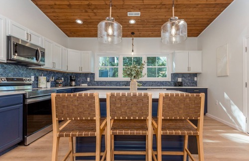 * Updated kitchen with stainless steel appliances, an abundance of cabinetry, Quartz Countertops. Fully stocked with drip coffee maker, crockpot, blender, toaster, plates, cups, wine glasses, silverware, cookware, pots and pans, etc!