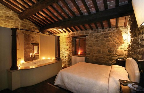 Are you looking to rent you own private and exceptional castle? Here it is! Castello del Falco is an authentic and impressive castle dating back to medieval times. The sturdy 11th century tower is definitely its most striking feature and can be seen from the far off distance. It is situated at a hilltop and surrounded by the smaller buildings of its own quaint little hamlet. The stones with which it all has been built have been laid many centuries ago and are silent witnesses to times long gone by. The atmosphere is truly unique and somewhat magical, with arches, passageways, a little old church, staircases left and right and with beautiful roses ubiquitous throughout the gardens.