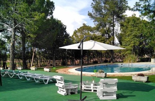 The Villa consists of 7 rooms with individual bathrooms, and 2 more for common use, large living room with huge fireplace and plasma TV, kitchen with dishwasher; oven; microwave; coffee maker; kettle for infusions; toaster; juice squeezer; electric paella pan; electric pan; and all kinds cooking utensils. Outside you will find a large wooden porch with marble table and typical decoration from La Mancha, opposite a garden with meadow grass, free private parking inside the property, barbecues with all utensils (pans, stew pans, sauce pans, kitchen tongs; kitchen grills...), wood-fired oven for your use, sand playground, 2 paddle tennis courts and 1 tennis court, ping pong table, almond and walnut promenade, and giant private pool with solarium, dining area and 1.000m2 area of grass decorated with rose; bays; laurels; pines and flowers of each season of the year.