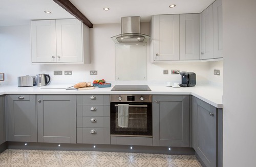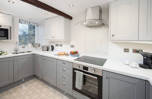 The spacious lounge and dining area boasts an original style window and built-in window seat as the walls are so thick. The lounge has a deep comfortable sofa and a luxury velvet armchair, complemented by stylish full length curtains and luxurious carpets. The lounge also has indirect lighting and has retained the original wooden beams. A wood-burning effect electric stove is provided on a slate hearth for extra ambience. The contemporary glass dining table generously sits two with plush luxury velvet chairs. There is a large wall-mounted Smart TV and Blu-Ray player, as well as a selection of books and board games. Wi-Fi with free superfast broadband is provided throughout the apartment.