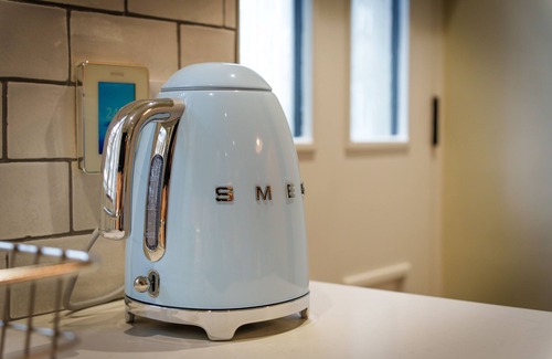 The property spans three floors, starting with the ground floor, comprising the cosy living room with a wall-mounted Freeview TV and the gas log-burner-effect fireplace. Across the central corridor, to the rear of the property, is the lovely kitchen with modern appliances and a dining table that can be extended to accommodate four guests. The rear door from the kitchen leads to a small outdoor area with seating.