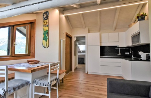 4-room apartment 80 m2 on 3rd floor. With sloping ceilings, fully renovated in 2023, comfortable and beautiful furnishings: living/dining room, ceiling height 85 - 320 cm with sliding door, panoramic window with dining table, dining nook and TV. Exit to the terrace. 1 double bedroom with sloping ceilings, ceiling height 85 - 240 cm with rooflight. Exit to the terrace. 1 room with sloping ceilings, ceiling height 85 - 240 cm with rooflight with 1 french bed (140 cm, length 190 cm). 1 room, ceiling height 85 - 240 cm with rooflight with 2 beds. Exit to the terrace. Large kitchenette (dishwasher, 4 induction hot plates, toaster, kettle, electric coffee machine, Capsules for coffee machine (Nescafè Dolcegusto) free, combination microwave). Exit to the terrace. 2 showers/bidet/WC, Hammam-Shower. Heating. Parquet floors. 2 small terraces covered. Terrace furniture. Very beautiful panoramic view of the mountains, the valley and the town. Facilities: washing machine, children's high chair, baby cot, hair dryer. Internet (WiFi, free). Parking space n 48 (roofed) at the house. Please note: suitable for families. Non-smoking house. No lift. IT014037C28VFU9SP8