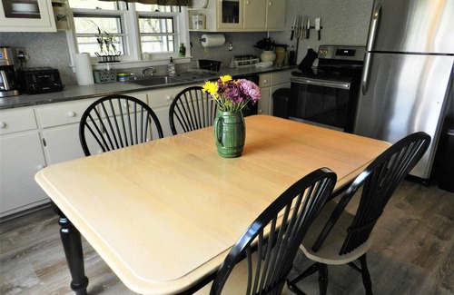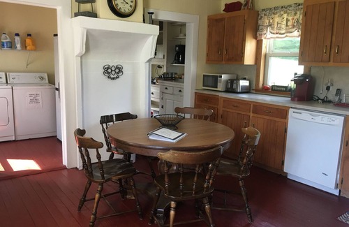 The larger rambling farmhouse has a huge gathering room with a 9 foot dinning table, pool table, piano & comfortable seating areas. A TV room with large flat screen TV.A cozy living room, An eat-in kitchen. 3 bedrooms downstairs (1 king with private bath, 1 queen and 1 bedroom with 2 single beds. A full bath and sun porch complete the 1st floor. The second floor has 2 bedrooms (1queen bedroom and 1 large bunk room that sleeps 4 (great place for kids)