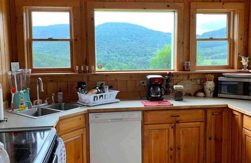 Welcome to Windy Ridge! Enjoy the rolling hills of country living and lounging on the wrap-around deck or next to the wood-burning stove. Our delightful country home offers a first floor bedroom with master bath, plus two additional bedrooms and full-bath on the second level. The hallway balcony overlooks the first-floor, and the skylights and vaulted ceiling offers an airy feel. There are views from every room, including a panoramic scenescape from the kitchen overlooking the nearby mountains.