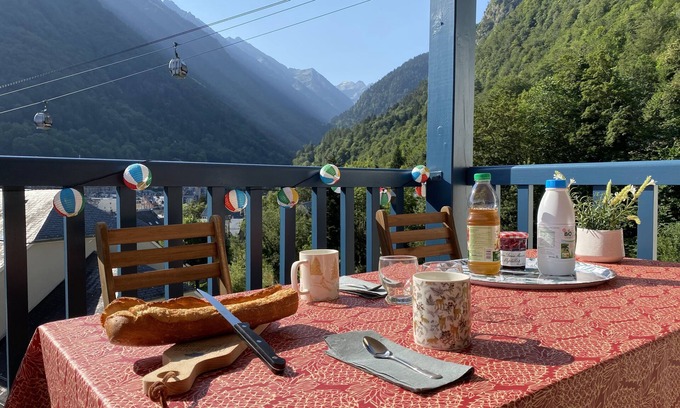 - Covered terrace of 8 m2 with beautiful view on the mountains, village and steam ("Le Gave de Cambasque"). Fully equipped with a table and 4 chairs (ideal for eating out) as well as a deckchair for napping.