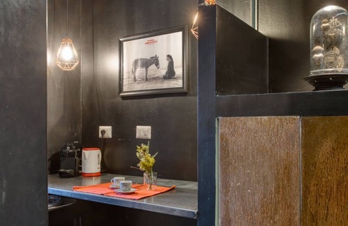 The flat\'s finishing touches in dark black tones lend eccentricity to the space and set it apart from the crowd.
