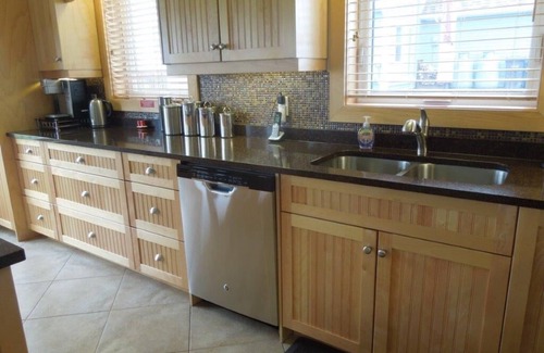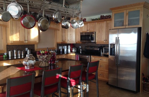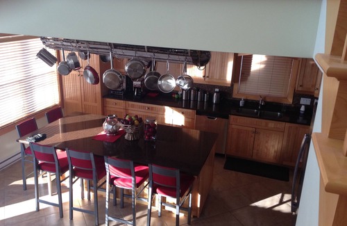 In the spacious and bright gourmet kitchen, guests will find an abundance of custom maple cabinetry, quartz counter tops, 4 stainless steel appliances, a full compliment of small appliances by Kitchen Aid and Cuisinart, and a wide selection of PEI's own Paderno pots. Guests will enjoy dining at a kitchen Island that seats 6 in an open concept kitchen/living room area.