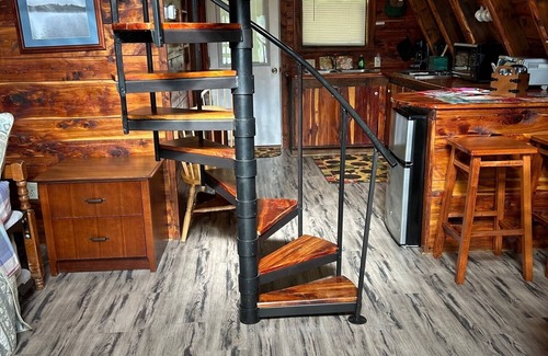 This cabin is complete with large beams and an all-wood interior, spiral staircase, cedar cabinets and skylights.