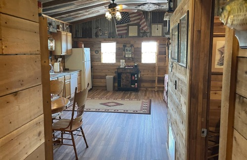 A totally private cabin on the farm, upstairs overlooking a beautiful pond. Facing morning sunrises over the trees. Totally quiet, with no traffic on a dead end road. Enjoy your coffee while watching deer pass by daily to feed and refresh them self in the pond. Inside the rustic cabin are 1" thick cedar walls, completely furnished for an amazing and relaxing stay.