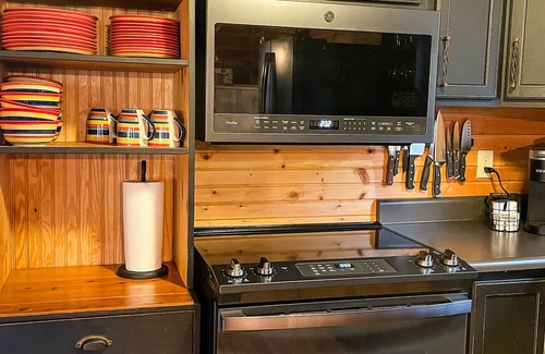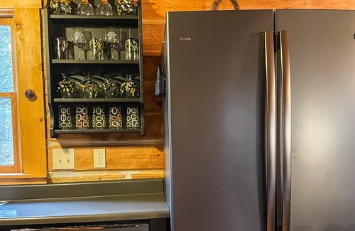 The main floor is open concept, with a cathedral ceiling. The living room has a couch with cozy blankets, recliner, & coffee table. For your entertainment, a smart tv, board games, cards & coloring supplies for the kids are available. A baby gate is available at the bottom of the stairs. In the dining room, you will find a table with space for 8 & a large cabinet with pantry space. The kitchen is stocked just like home! Silverware & serving utensils, plates & bowls, glasses, pots & pans, casserole dishes, colander, cooking sheets, knives & cutting boards, microwave, slow cooker, & more are available. Our refrigerator is full size with an ice maker. A drip coffee machine & Keurig are both available.