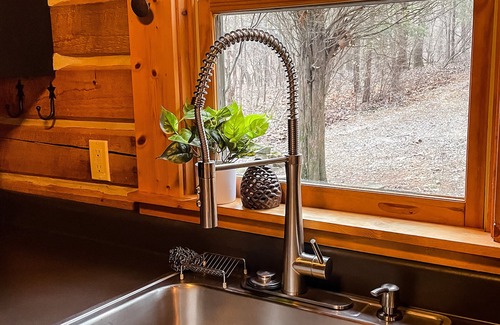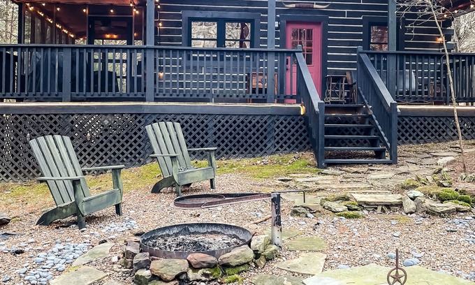 Outside, you will find covered porches with string lights & plenty of seating for enjoying the beautiful woods & watching the wildlife! The front porch has a view of the fire pit & the side porch is screened & features a mini fridge. A charcoal grill is available just out the back door of the cabin.