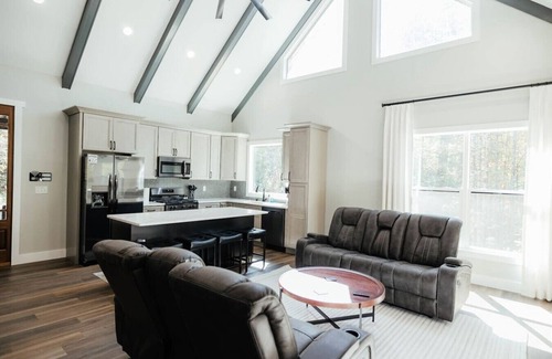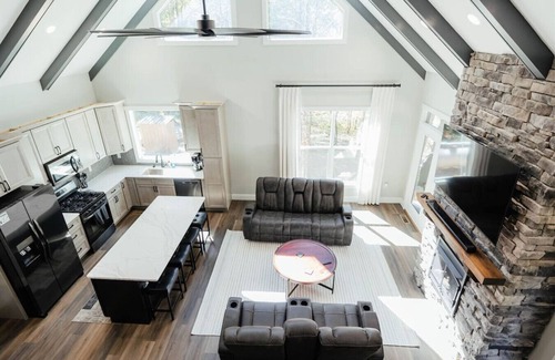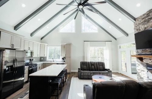 The huge wooden front doors create a welcoming front porch space that draws you into this newly built cabin for your whole family to enjoy! Step inside to the great room with soaring vaulted ceilings that round out the living space with a full gourmet kitchen featuring a gas stove, oven, fridge and dishwasher. The cabin sleeps 6 with a king bed in the master, twin bunks in the second bedroom and a queen in the loft. Two and a half baths ensure everyone's comfort!