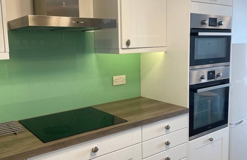 Kitchen & dining area with under floor heating, induction hob, fridge/freezer, double oven, microwave, kettle and toaster.