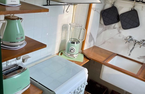 The kitchen may be small, but it's packed with charm and everything you need to whip up a delicious meal while traveling. Enjoy cooking with our adorable Ariete Vintage collection, which includes a milk frother, toaster, kettle, smoothie maker, pan, and a pot with a lid. You'll find a Nespresso machine to make your morning coffee, with complimentary capsules and tea bags to start your day off right. There's also a microwave for quick meals and a fridge to store your groceries.