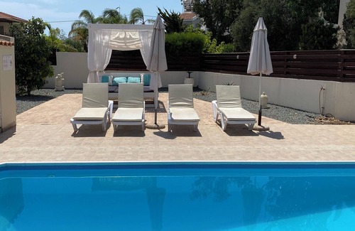 This exquisite villa is located in an exclusive area, a short walk from the centre of Protaras and the beach. In a quiet cul-de-sac of only 6 villas surrounded by trees and open fields. Situated at the foot of St Elias church which is lit up in the evening and is a spectacular sight. The villa has 3 bedrooms, one on the ground floor, ideal for easy access with a shower room and two on the first floor with a shared bathroom. Both upstairs rooms have patio doors leading onto a large shared balcony. One of the bedrooms also has patio doors leading onto a second balcony. The living/dining/kitchen areas are spacious and open plan with patio doors leading to a veranda and a 4 x 8m swimming pool. We have a table tennis table for your entertainment.There is an outside utility room, pool shower and barbeque area. There is also a driveway for offroad parking for at least 2 cars. The villa is set in large grounds with outside shaded lounge areas for relaxing and ample sun bathing space with the addition of a day bed. There is also a shaded dining area for al fresco dining. WIFI, live and on demand UK TV available.