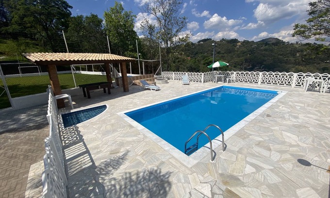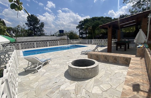Farm to spend great moments with your family and friends. 6. 500 m2 with swimming pool, lawn soccer field, kiosk with freezer, barbecue, wood oven overlooking the pool and field, playground, pool table and table tennis. House with accommodation for 12 people, has 01 suite w / 1 double bed + 1 single, 01 suite w / 02 triliches, 01 room w / 1 single bed and an extra double mattress that can be placed in the living room, living room / dinner, kitchen / pantry, 01 WC w / external shower, balcony, laundry.