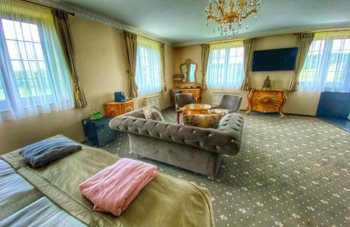 Château Šanov features a shared lounge, terrace, a restaurant and bar in Šanov. Free WiFi is available and private parking can be arranged at an extra charge. The hotel will provide guests with air-conditioned rooms offering a desk, a safety deposit box, a flat-screen TV and a private bathroom with a shower. Guest rooms include a closet. Guests can relax in the spa and wellness center, including an indoor pool, a fitness center and a sauna, or in the garden. You can play pool at this 5-star hotel, and bike rental is available. Vaclav Havel Prague Airport is 34 miles away.