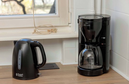 Gas stove, oven, electric kettle, refrigerator with freezer, coffee maker (pour-over), dishwasher, washer-dryer, set of dishes, kitchen utensils