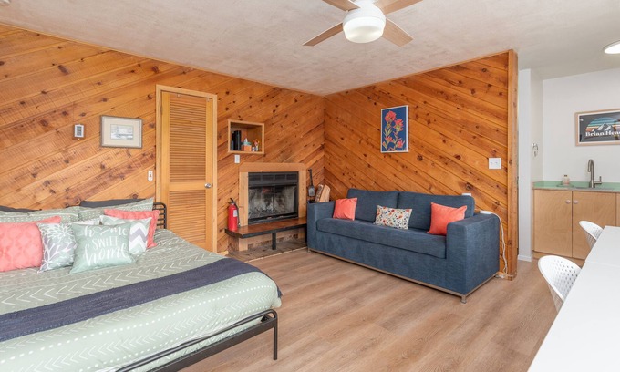 As you step into the studio, you'll be greeted by an inviting and contemporary ambiance, that you can bring your fur baby with you. The open floor plan allows for a seamless flow between the living and sleeping areas. The kitchenette is well equipped with all the essentials, including a mini fridge, 2-burner stove, and a coffee pot. Ample counter space provides convenience for meal preparation, and the closet space ensures that you have enough room to store your belongings. The bathroom features a shower-tub combo, allowing for a relaxing soak after a day of adventure.