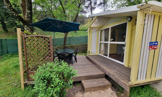 Pretty living room with equipped kitchen area: fridge, freezer, microwave, hob, coffee maker and kitchen essentials 2 bedrooms: 1 bedroom with 1 bed 140 and 1 bedroom with 1 bunk bed 90 and 1 single bed 90. Bathroom with shower and toilet. 25m² chalet Shaded terrace with garden furniture Its large bay window will give you the impression of living IN THE MIDDLE OF NATURE .
