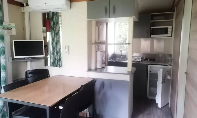 Details: Wi-Fi access : paid on site Family animations : during the day and in the evening - in July/August Sports animations : some are with supplement - in July/August Pets allowed : €2/day for pitches and €3.50/day for accommodation - category 1 and 2 dogs prohibited - vaccination certificate required - to be paid on site Barbecue : in addition - 10€/week - to be paid on site Deposit (in supplement) : 500 Air conditioner Grocery store : depot of breads and pastries - in July/August Final cleaning fee : optional - from €60 to €90 depending on accommodation - to be paid on site Bedding : 11€/single bed - 14€/double bed - to be paid on site Mini golf : Yes Number of stars : 4 bowling Ping Pong : Yes Swimming pool : heated exterior - open from June - free access during opening hours (to be consulted on site) Possibility of bike rental : extra - price and payment on site Hiking Restaurant : on site - throughout the season Tourist tax (surcharge) : 0.20€/day/person - to be paid on site Multisports ground : Yes Sin Surface (m²) : 30 Pets Allowed : With supplement - Tenus on leash Number of bedrooms : 2 Cooked Microwave oven Number of bathroom : 1 Number of toilets : 1 Television Terrace Barbecue Fridge Air conditioner Freezer