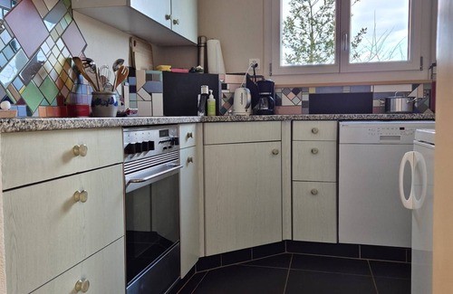 The 3-room flat is located on the ground floor of a detached chalet and has a large and a small terrace as well as free access to the entire garden. We live in the same house on the upper floor, have a small dog, and we also welcome guests with dogs. You can relax here in our natural garden, where deckchairs are available, or watch the birds and insects. The balmy summer evenings tempt you to sit outside and enjoy the evening with a barbecue and fine drinks. There is the opportunity to make pottery, alone or under supervision. Various types of clay and many glazes are available. The resulting piece can also be fired and glazed here.