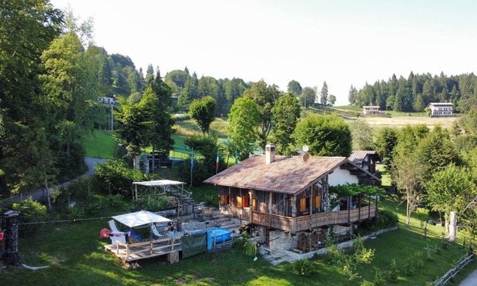 Totally independent mountain chalet at exclusive and total disposal. Sleeps 7. Pets not allowed. Living room fireplace queen size sofa bed hd tv satellite unlimited free wi-fi, kitchen dishwasher fridge freezer microwave etc 2 bedrooms, bathroom, terrace, laundry washing machine, private fenced garden, large barbecue, table and benches for lunch and dinner in the garden, mini swimming pool 1.60x2.40 for adults and children, sunbathing areas, games both in the garden and in the chalet for children, private parking for 2 cars. Altitude 1070 Treviso Bresciano Via Passo Fobia 34, Lake Idro 9 km, Lake Garda 22 km. Relaxation, walks, sports, where you stay safe and stay healthy.