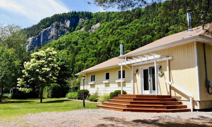 At the foot of a stone cape and bordered by the Bras-du-Nord River, this chalet offers you an absolutely magnificent out-of-the-ordinary decor. In the heart of nature, but ten minutes from amenities, this chalet is ideal for a peaceful stay. The chalet is located between the Cantin and Shannahan welcome centers of the Vallée Bras du Nord, THE outdoor destination in Quebec for mountain biking, hiking, canoeing/kayak, snowshoeing and much more.