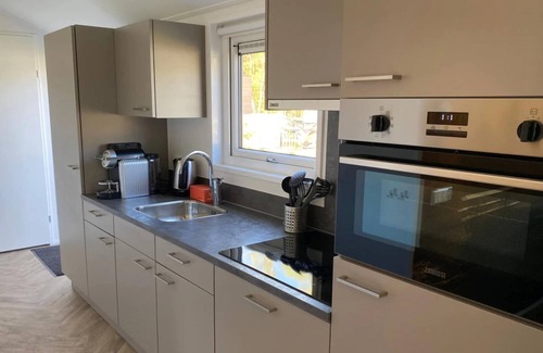 This detached chalet is located in the nature-rich holiday park of the De Hooge Veluwe Resort. It is located directly opposite the beautiful and unique Hoge Veluwe National Park, yet only 9 km away from the pleasant centre of the city of Arnhem. The single-storey, modern chalet is comfortable and fully furnished. There is a living room with TV, and in the open kitchen, you will find a dishwasher and a combination microwave. There are two bedrooms. Each has two single beds that can be arranged as a double. The bathroom has a shower and toilet. Around the chalet there is a garden with a terrace and garden furniture. There is parking for one car at the chalet. At holiday park Resort De Hooge Veluwe, various holiday homes, tiny houses, lodges, chalets and villas can be booked for two to eight people. Holiday park Resort De Hooge Veluwe is a holiday park in development. Construction work may take place during your stay. Every effort is made to minimize any inconvenience.