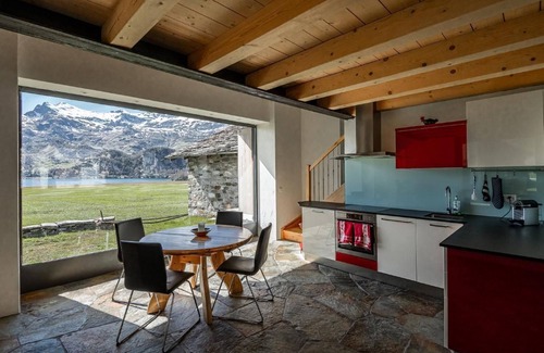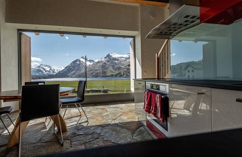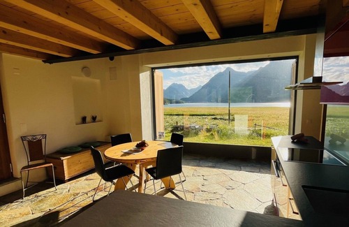 Outside, the small veranda or inside, the large window invites you to enjoy morning coffees or evening sunsets while marvelling at the view of Lake Sils and Maloja.
