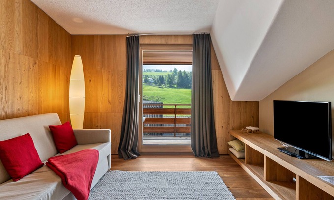 Overlooking the Alps, the chalet Compatsch with step-free interior in Kastelruth impresses guests with its fantastic views. The 50 m² property consists of a living room with a sofa bed for 2 people, a fully-equipped kitchen, 1 bedroom and 1 bathroom and can therefore accommodate 4 people. Additional amenities include high-speed Wi-Fi (suitable for video calls), a TV, a washing machine as well as a dryer. A baby cot and a high chair are also available. This chalet features a private covered terrace for evening relaxation.