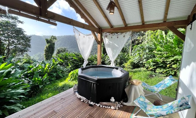 Offering a garden, Chalet de Dolé offers accommodations in Gourbeyre. The chalet, set in a building dating from 2023, features free Wifi and free private parking. Guests have access to a hot tub and spa facilities. Featuring a terrace with garden views, this chalet also comes with a flat-screen TV, a well-equipped kitchenette with a microwave, a toaster, and a fridge, as well as 1 bathroom with a hot tub. The accommodation is non-smoking. Pointe-à-Pitre Le Raizet Airport is 31 miles from the property.