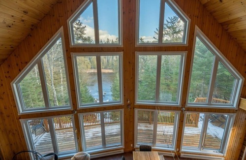 The cottage is large and spacious, nestled in the trees on the banks of the Ouareau River.