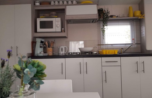 Suitable for a maximum of 4 adults: 1 separate bedroom with a fixed double bed (140 x 200) and wardrobes for your clothes and luggage and in the living area 1 convertible sofa (150 x 225) suitable for 2 people. Blankets and comforters are present in the chalet, as well as the associated linen once (the costs for this are included in the cleaning or service costs). If you need a new package during your stay, we can arrange it for you at an additional cost per package. Please note: Bath towels are not available. There is also a dining area with a pull-out table and 4 chairs, a complete kitchen with a gas stove, refrigerator, microwave, coffee maker (senseo), kettle, kitchen utensils, pans, plates, cups, dishes, glassware and cutlery. There are also kitchen towels and things to keep the chalet clean, a small vacuum cleaner, washing-up bowl, brush and sponges. There is a radio / CD player. TV with free satellite channels (astra 1,2 and 3). Outside there are two wonderful sun loungers to relax on, a seating area with 4 chairs, table and umbrella and a small barbeque that you can use. For colder days, the chalet has a gas heater so that you can get nice and warm everywhere. The chalet also has a spacious bathroom with toilet, shower with hot water and a washbasin with mirror. In short, a wonderful retreat at a nice campsite near the beach.