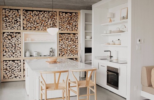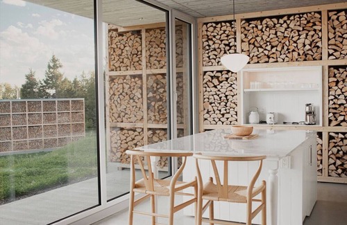 The pavilions complete the TERACEA offering with a series of independent, comfortable, and intimate dwellings. These are true sanctuaries where harmony of materials takes center stage. Built into the hillside, they naturally blend into the landscape at the heart of the property. This open-air village, which also includes the shared amenities, is called Le Hameau. Designed to offer maximum privacy, each pavilion has its own private entrance, is enclosed on three sides, and extends into a sheltered terrace overlooking the river. Their layout has been carefully thought out to offer a unique vacation experience one that feels like having your own private, fully equipped suite in the heart of Charlevoix’s natural beauty. Inspired by the surrounding woods, the pavilion exteriors feature an elegant stacking of logs, exposing their pale cut ends for a look of warm modernity. Inside, Florent Moser, in collaboration with architect Alain Carle, has created a rustic space wrapped in luxurious comfort.