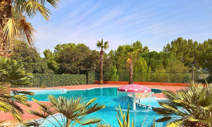 This 34m2 2-bedroom cabin Cap d'Agde. Located in a lovely pine grove on the side of a hill, you'll enjoy amazing views of the Mediterranean Sea and the lake of Thau when you stay in this area. Enjoy access to the outdoor pool and the boules pitch at our pedestrian resort! This is your perfect home away from home.