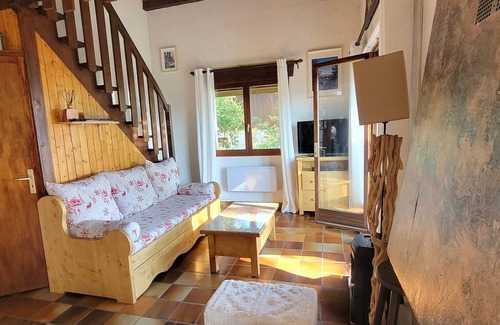 Chalet fitted for 10 persons with paronamic view over the valley, near the ski slopes, restaurants and walking trails, built on 3 levels: entrance hall, living-room with TV, south balcony and a well equipped fitted kitchen ( washing machine, dischwasher, fridge, oven, hobs, micro-wave) 1 room with a double bed, bathroom with bath and separated toilets, Upsatairs: 3 bedrooms , 2 with a double bed (140) 1 with 2 single beds, Downstairs: 1 double bed + 1 shower room with toilets, additional electricity charge (100€/week winter season).