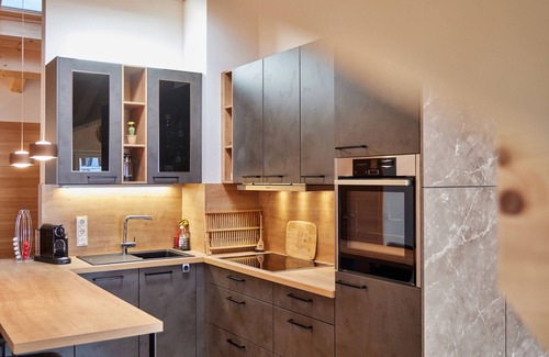 The modern kitchen is equipped with everything you need and leaves little to be desired thanks to an induction cooker, oven, dishwasher and a refrigerator with freezer compartment. Lovers of fragrant drinks have a French press and a capsule machine at their disposal.