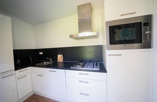 Pavilion 4 is a detached chalet that is suitable for 4 persons. In the living room you will find a sitting area with television and a separate dining area. The open kitchen is equipped with a microwave, dishwasher and coffee machine. This chalet has 2 bedrooms: 1 bedroom with a double bed and 1 bedroom with 2 single beds or a bunk bed. There is also a bathroom with a shower and toilet. Through folding doors you can reach the outside terrace with garden furniture. You can park 1 car at this chalet and there is free Wi-Fi. Please note that the park is located in nature and that the WiFi is not as fast as you are used to at home.