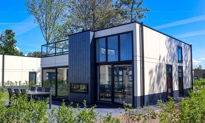 The Cube Elite 6 stands out with its high windows and modern architecture. The detached chalet also has a spacious roof terrace and is suitable for 6 persons. In the living area you will find a sitting area with see-through gas fire and television, dining area and kitchen with a combi microwave, dishwasher and Nespresso Machine. The chalet has a total of 2 bedrooms with 2 single beds and a sleeping loft for 2 persons. The bathroom has a shower, toilet and sink. Both the roof terrace and the garden have garden furniture. At the chalet you can park 1 car and you can use the free Wi-Fi.