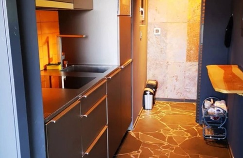 1 single bed in the kitchen with equipped kitchen, bakery, microwave, fridge with freezer, coffee maker, Nespresso (capsules are not provided), a large terrace with table, bench and chairs